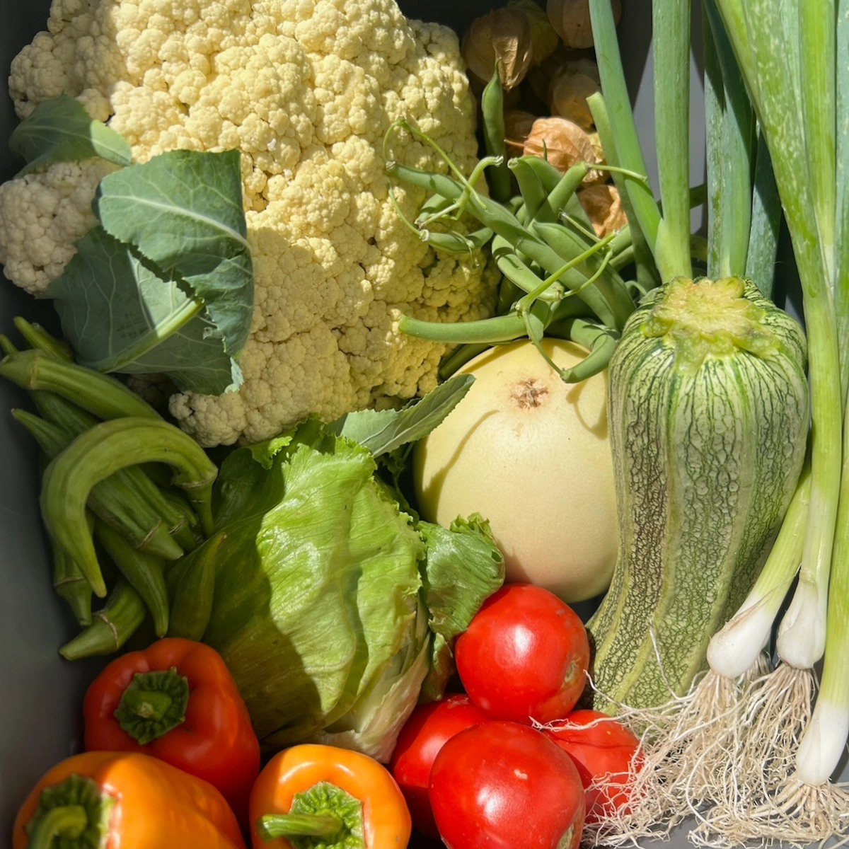 Each box includes 6 - 9 fresh vegetables with the occasional fruit, dried grain, or kitchen product.